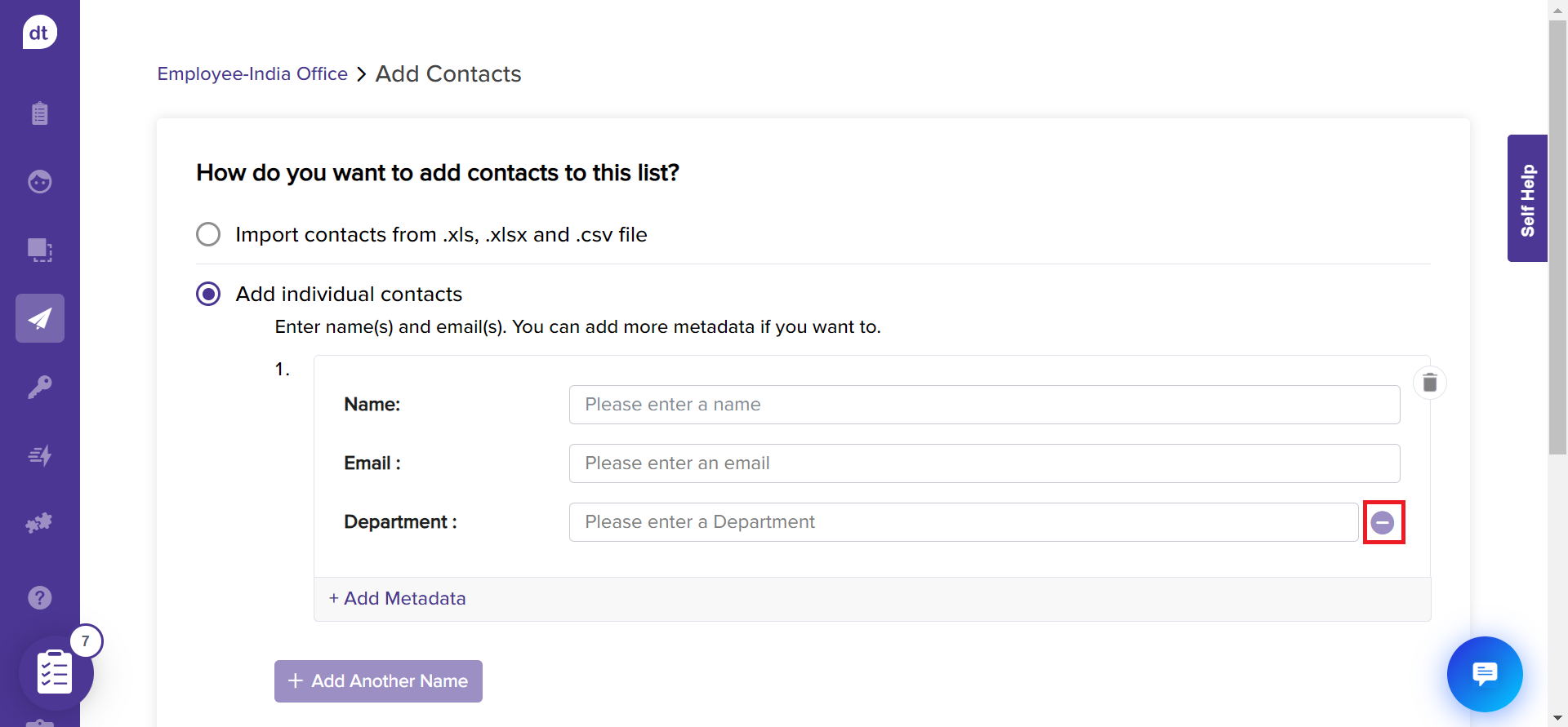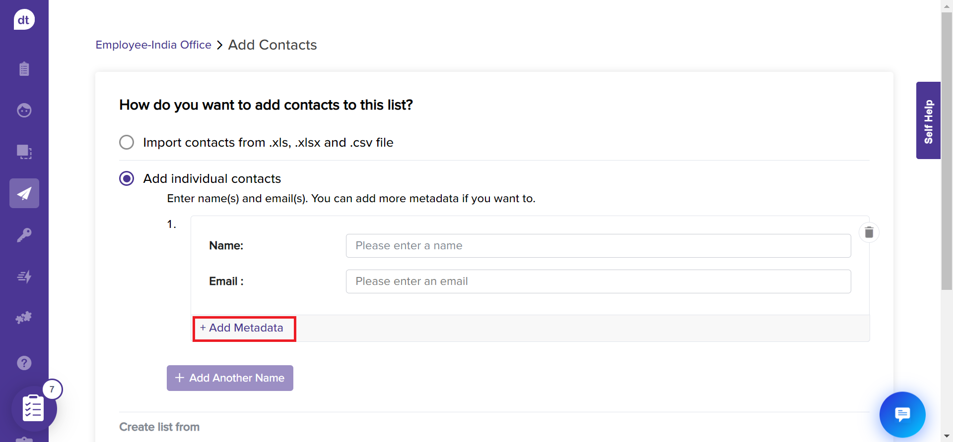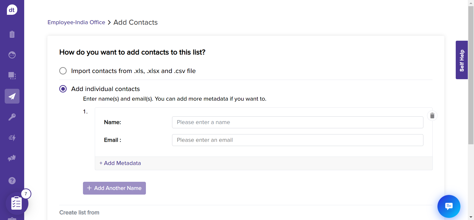 Click on Add individual contacts. The Name and Email field will automatically pop up. These are mandatory fields for any contact details.