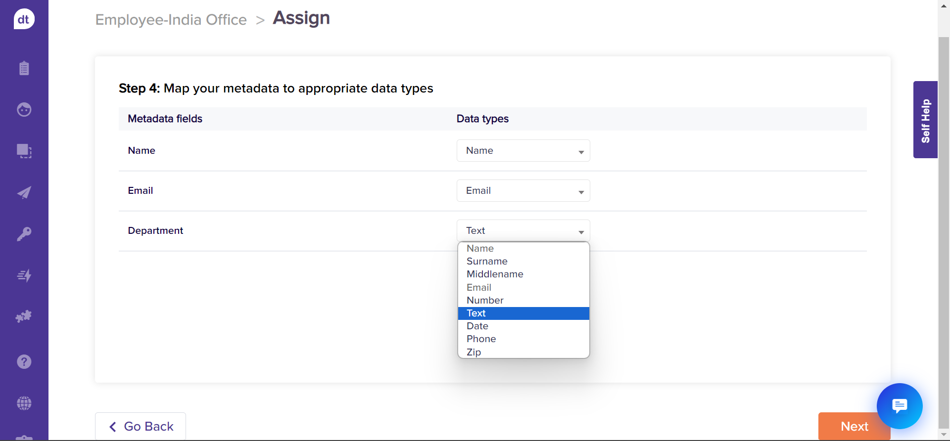 Click the dropdown menu against each metadata field and choose the appropriate data type.