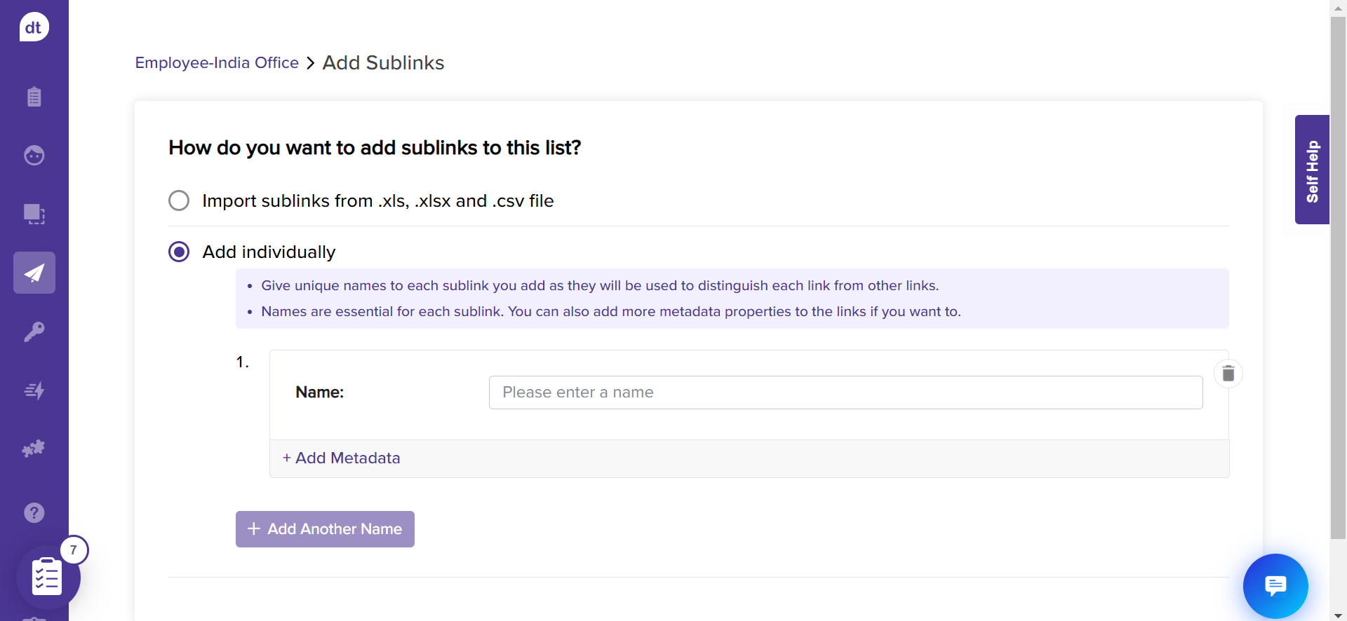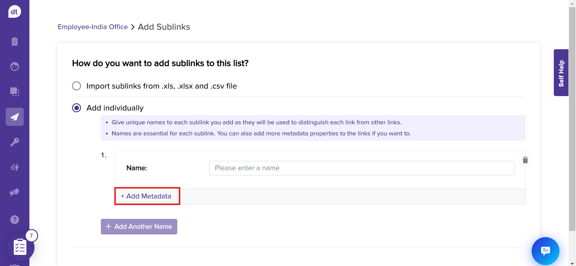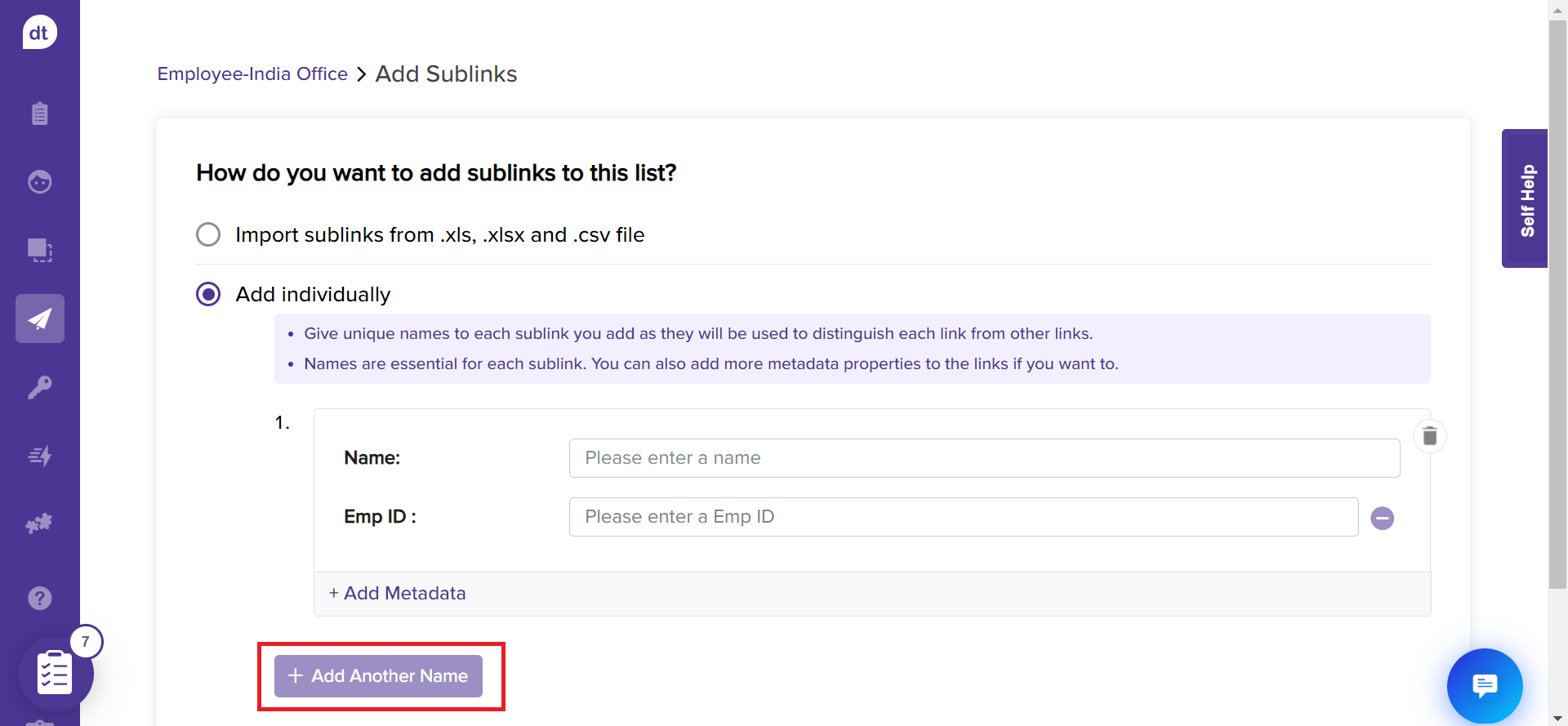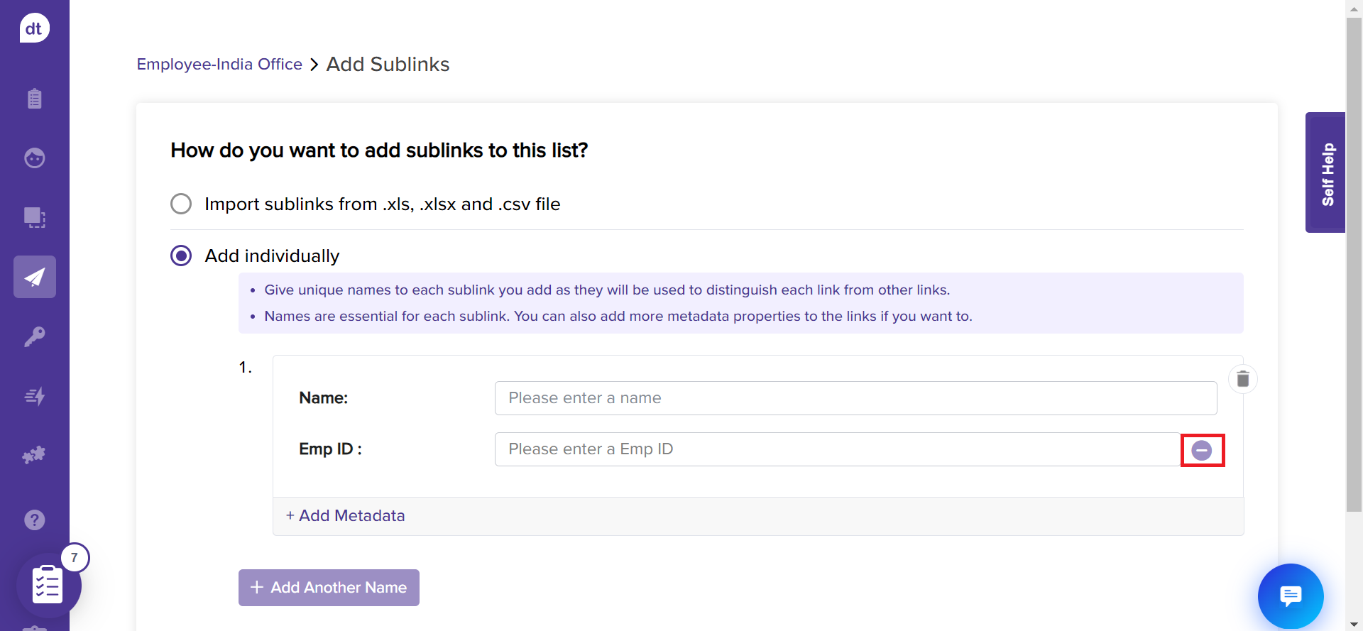 Click on Add individually. The Name field will automatically pop up. These are mandatory fields for any sub-link details.