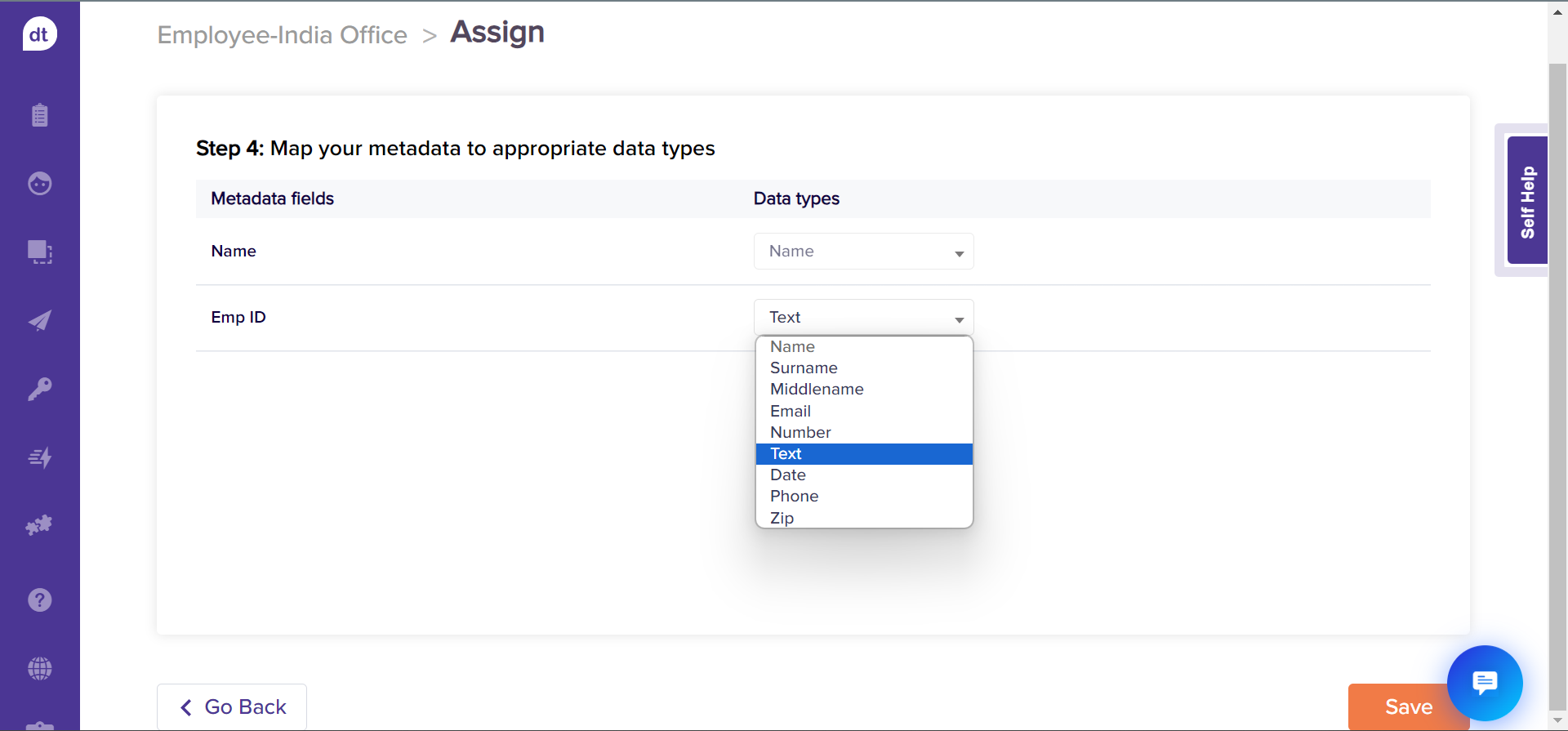 Click the dropdown menu against each metadata field and choose the appropriate data type.