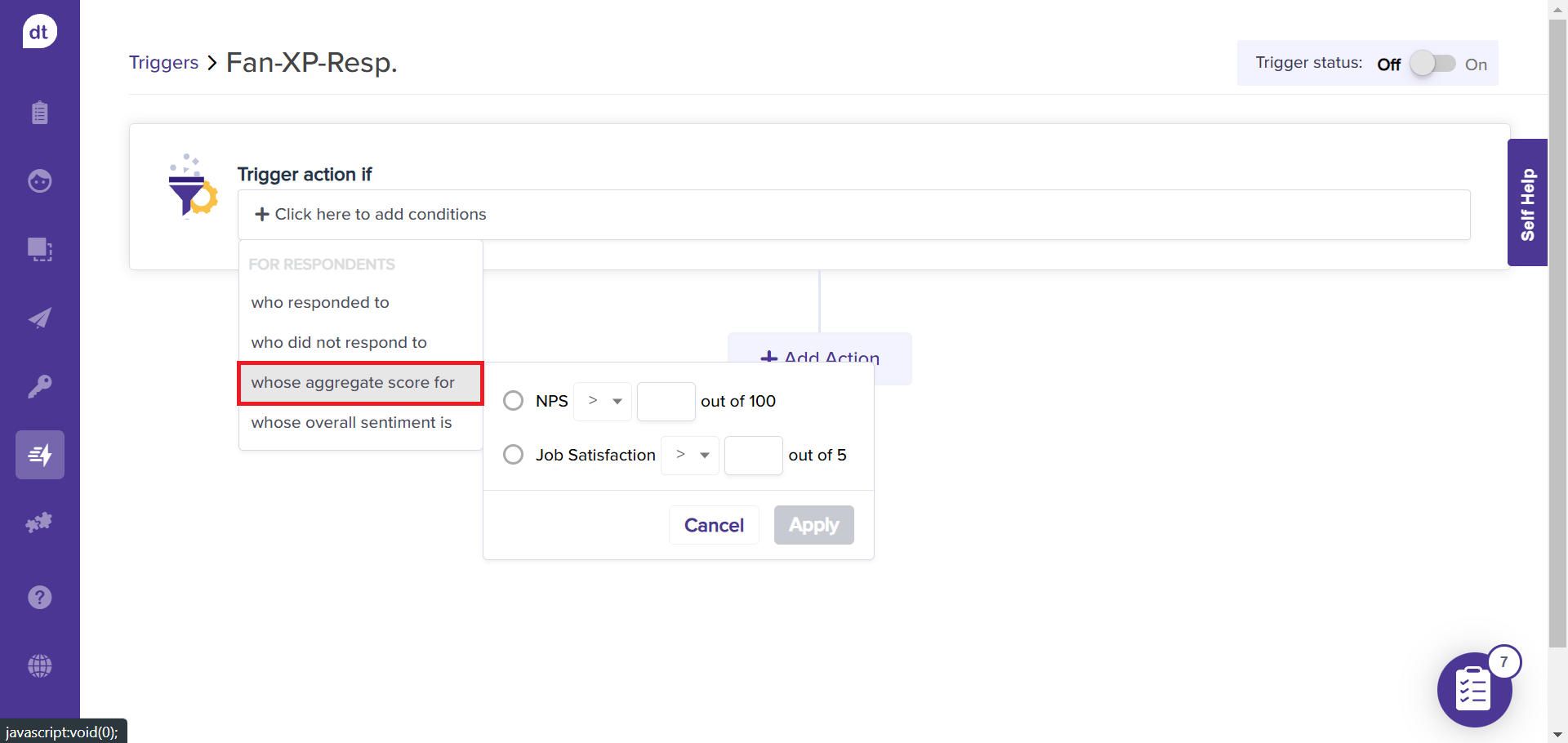 For example, you can set the condition as whose aggregate score for → NPS <7, and send a response to the respective respondent.