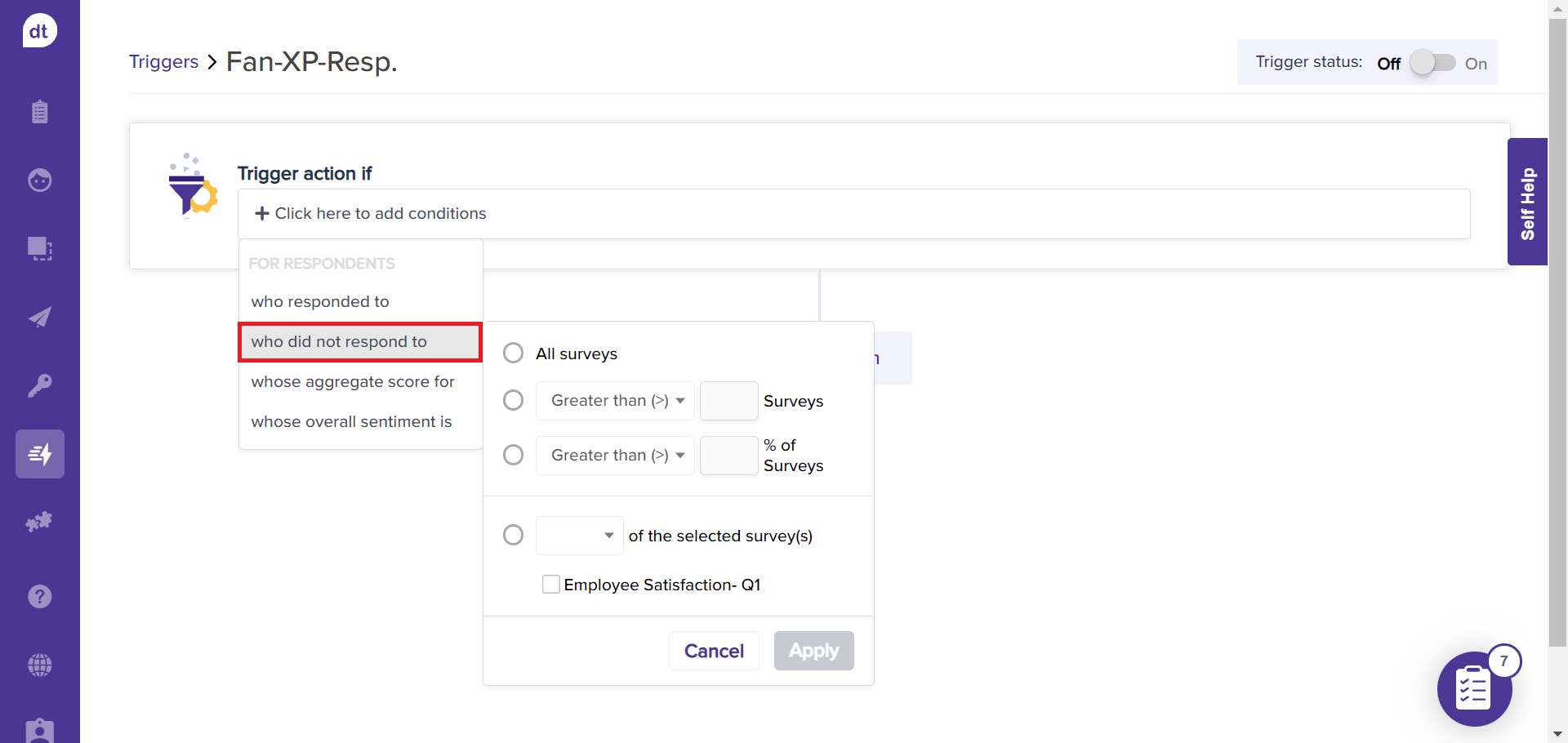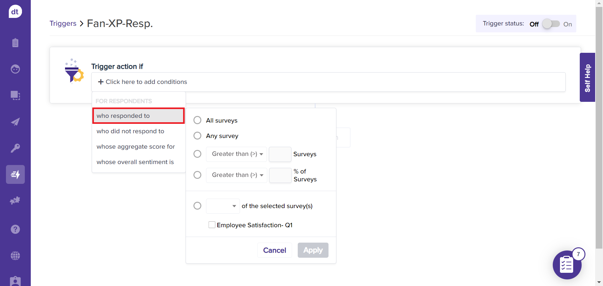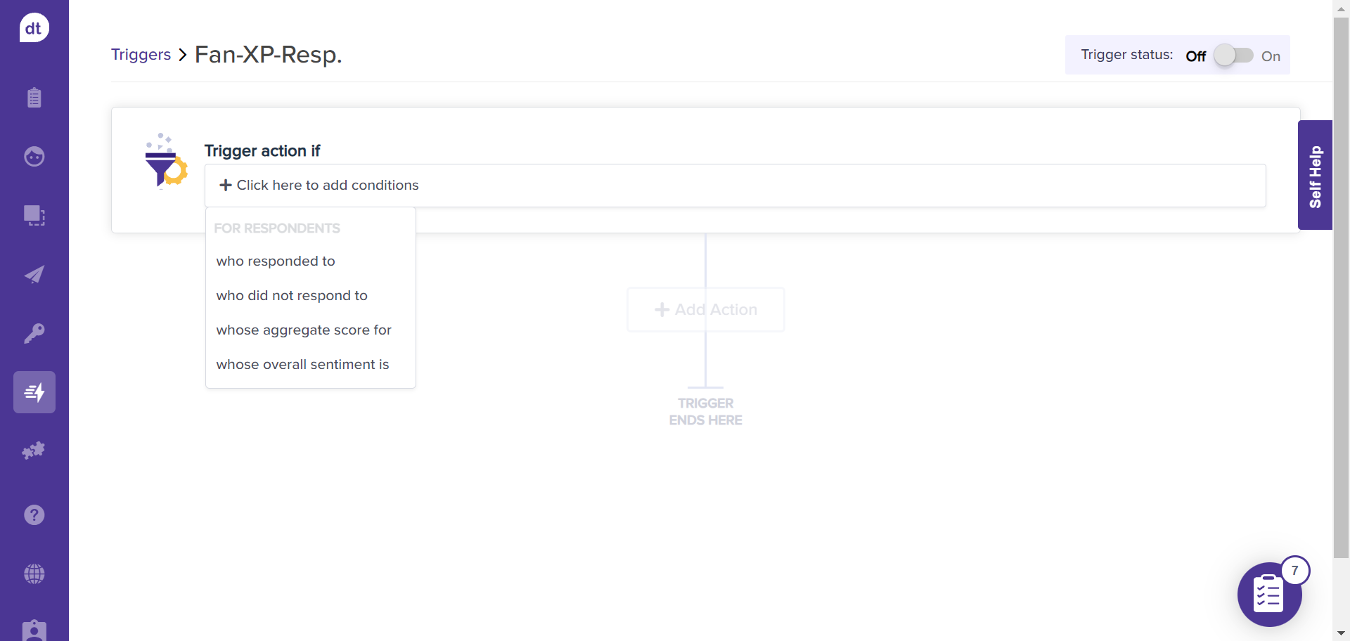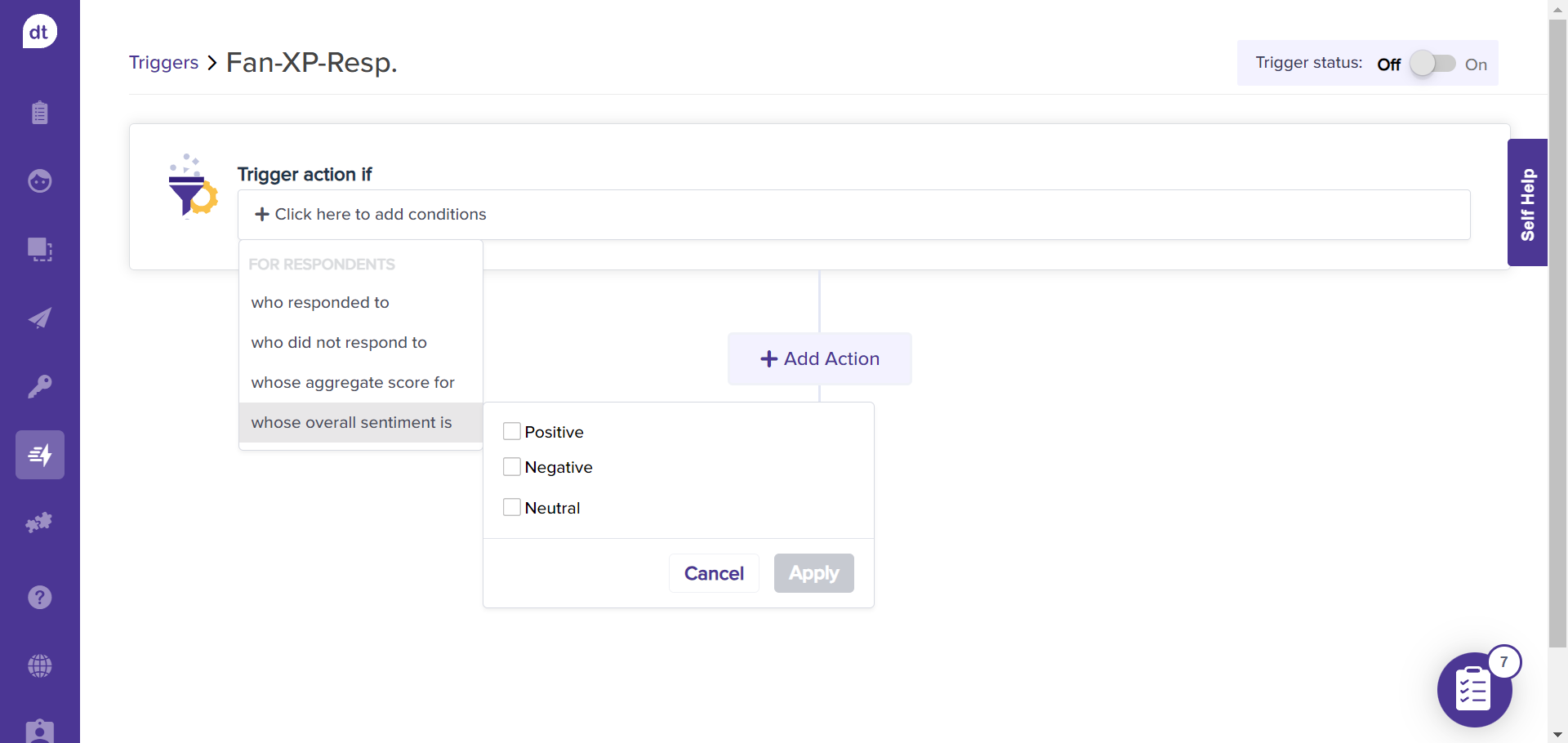By selecting this condition, the overall sentiments of the respondent are determined as negative, positive, or neutral. Based on this, you can set up a trigger.