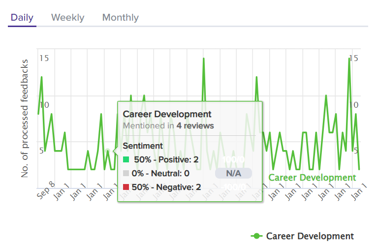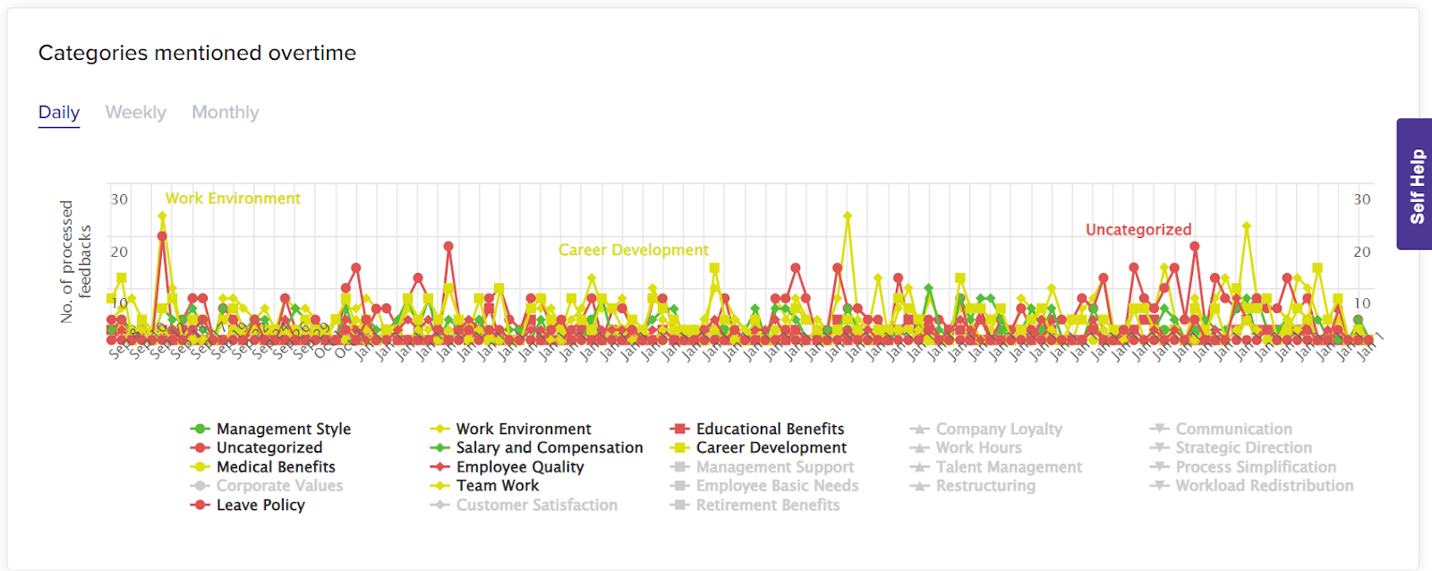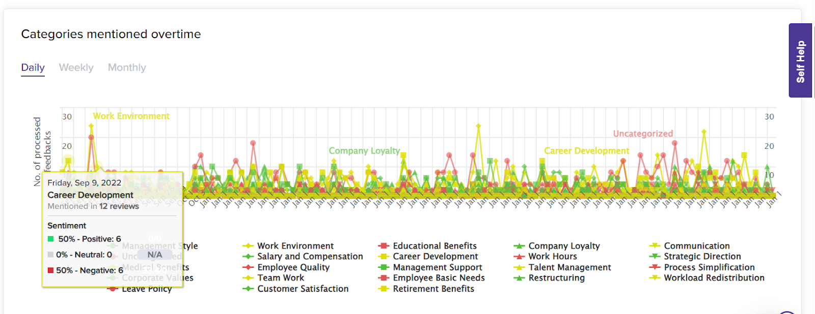 The section displays all the categories mentioned for the selected question duration of the program. It is displayed with the date on the X-axis and the number of processed feedback on that particular day on the Y-axis.