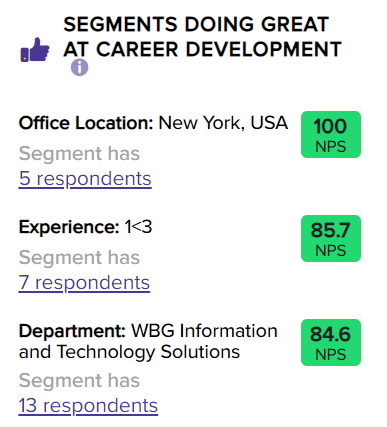 Segment doing great at <selected category>: Click on the respondents count to view their responses.