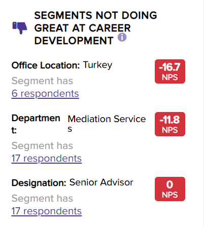 Segment not doing great at <selected category>: Click on the respondents count to view their responses. |