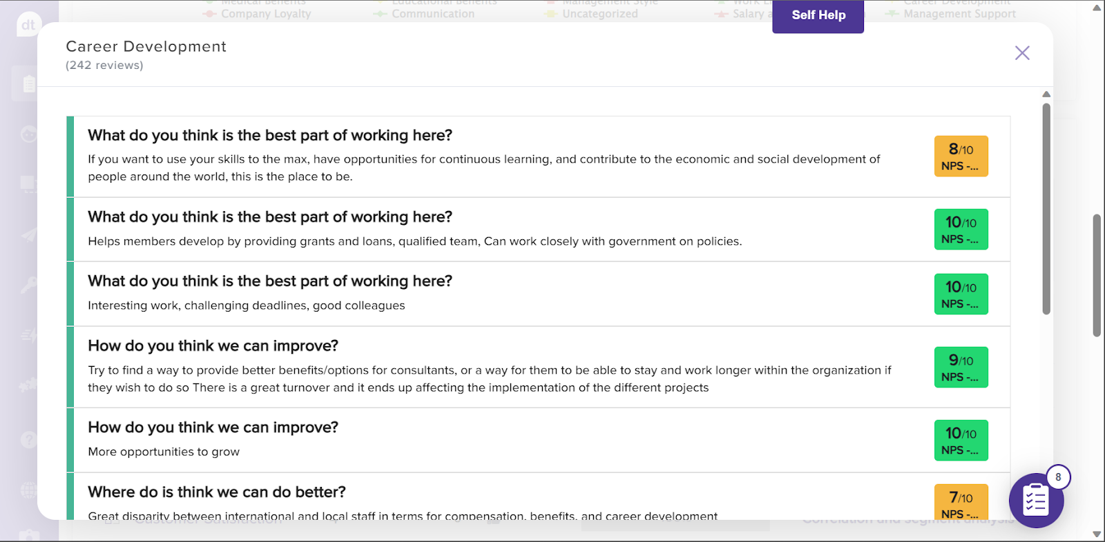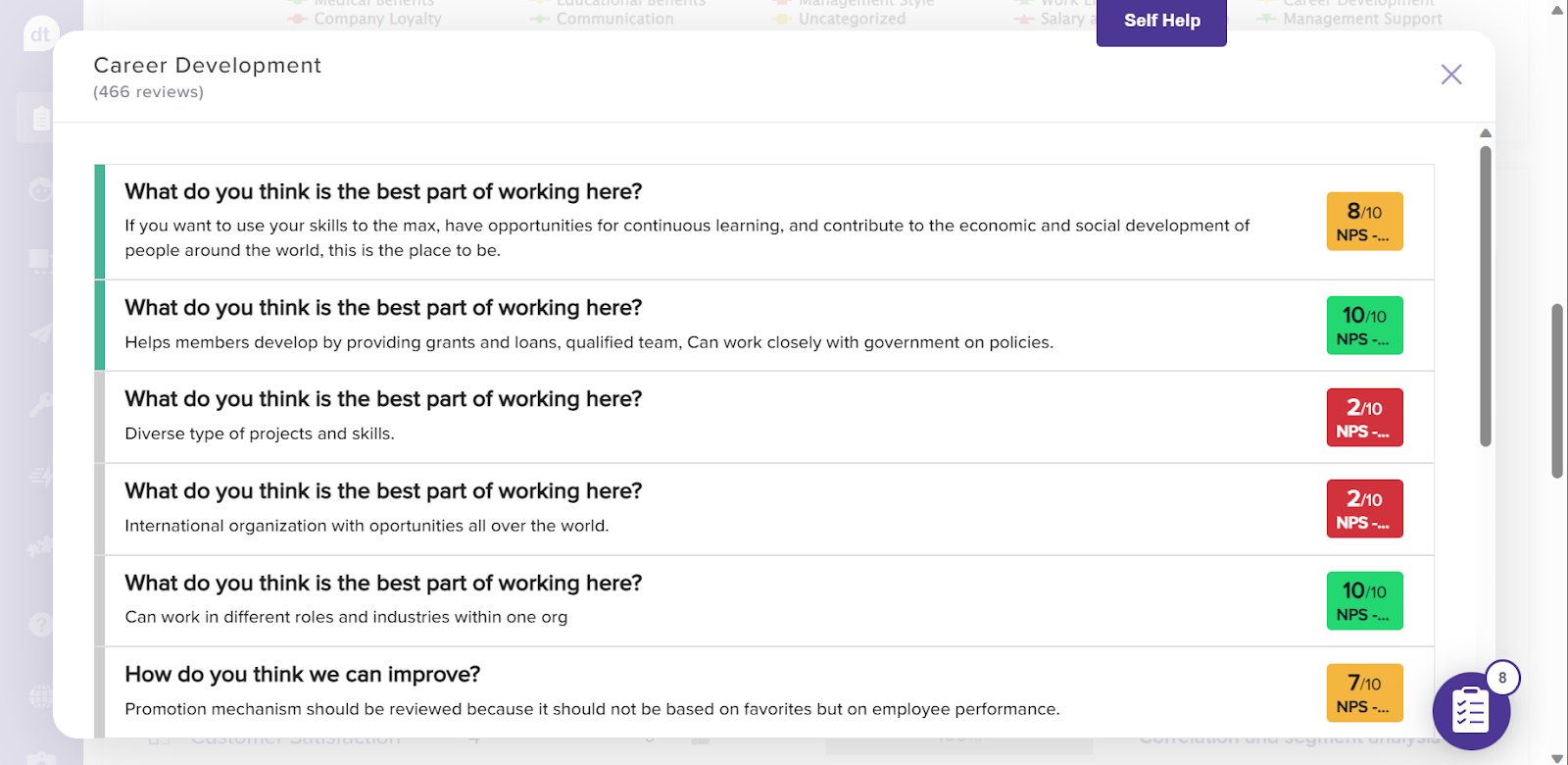 Click on the Category name to view all the responses received mentioning the respective category. The pop-up also displays the total responses with the category mentioned and NPS. |