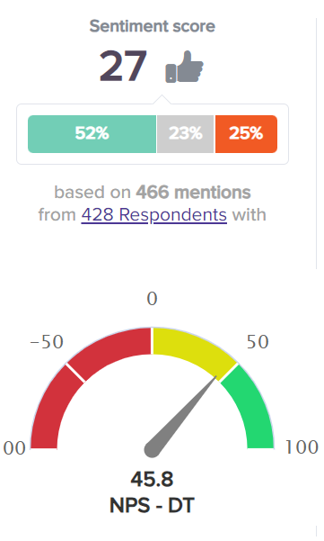 Correlation and Segment Analysis: Sentiment score, percentage breakdown, considered number of mentions, respondents, and NPS rating |