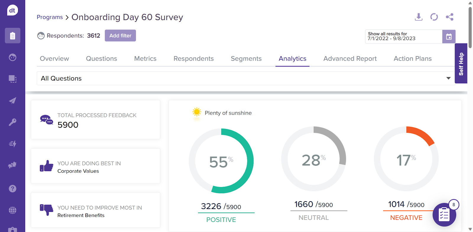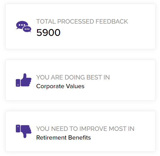 Total Processed Feedback: displays the number of feedback processed for the selected duration and question. You are doing best in: displays the category with the most positive sentiment. You need to improve most in: displays the category with the lowest negative sentiment. **If two categories have received the same sentiment percentage, the one mentioned in most of the responses will be given prominence.