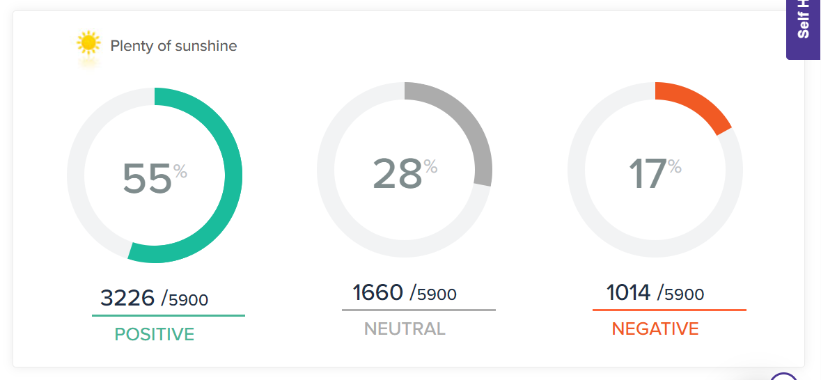 Segment doing great at <selected category>: displays the top three segments where the respective category has received the most positive sentiment score based on the mentions from the total responses with the category.