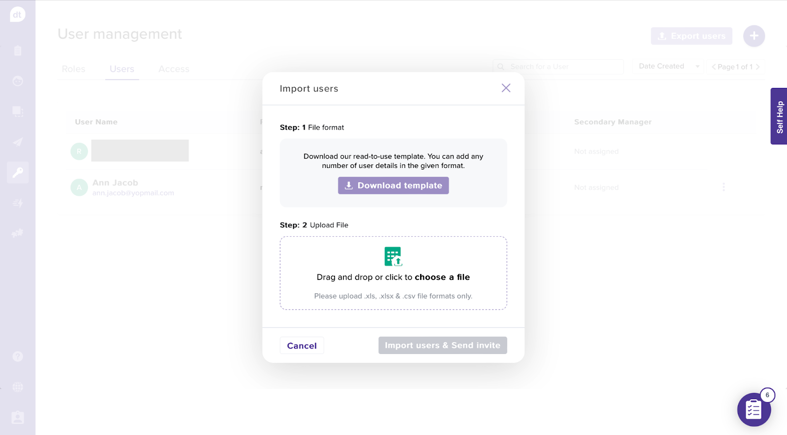 Upload the file once you have the user details in the required format. You can drag and drop the file or browse and select the file.