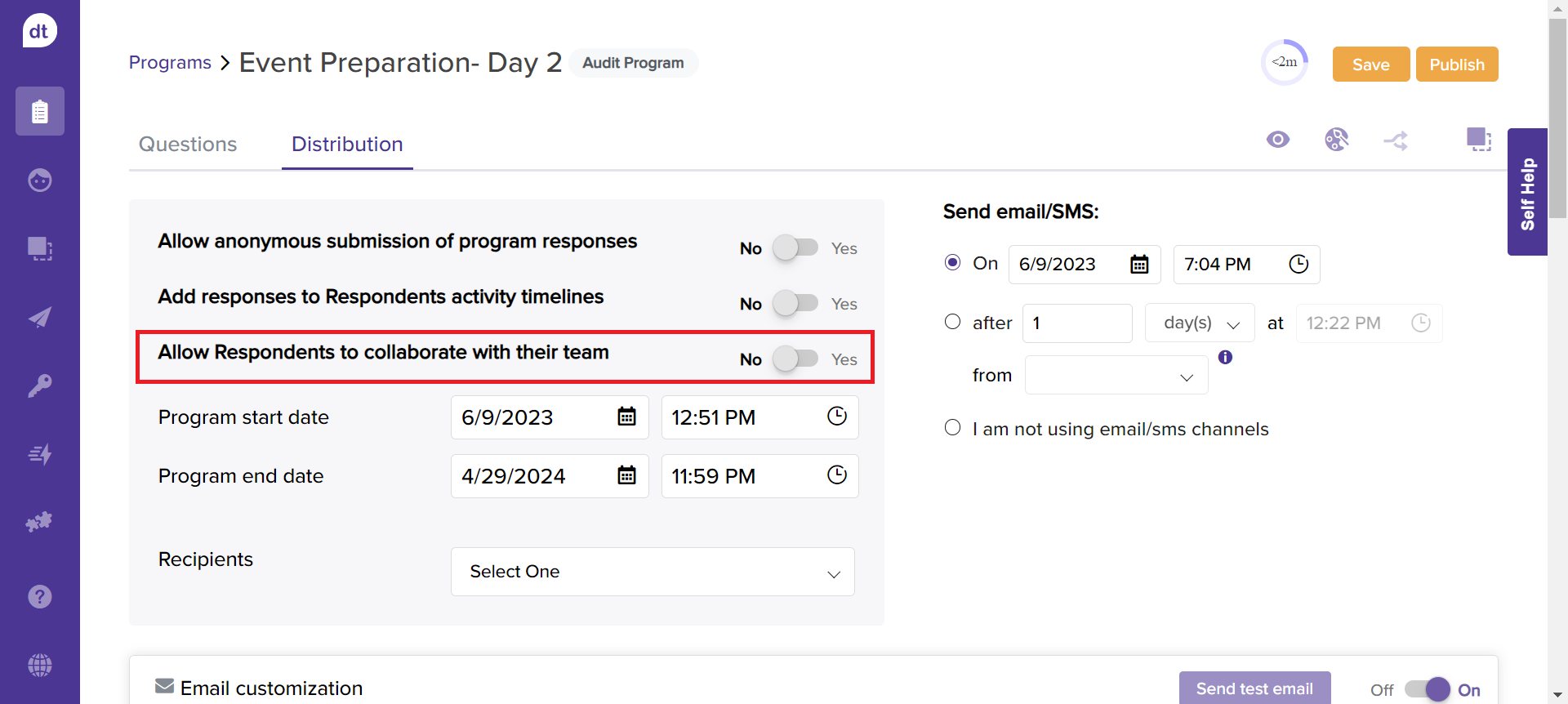 From the program’s Distribution tab, toggle the button ON for Allow Respondents to collaborate with their team.