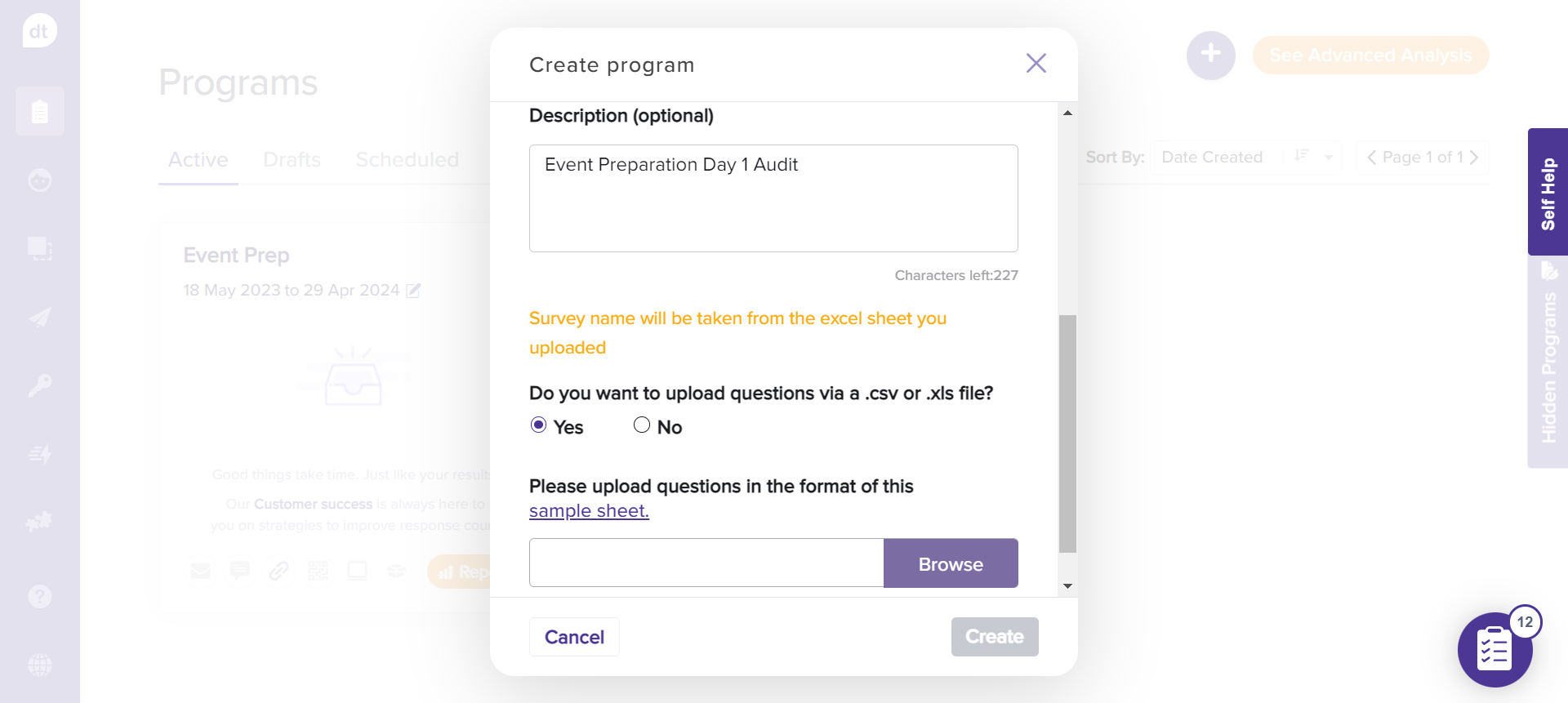 You can also download a sample format by clicking the sample sheet. You can always edit or add more questions after uploading from the Excel sheet.Click on Create and proceed to the questions edit page.