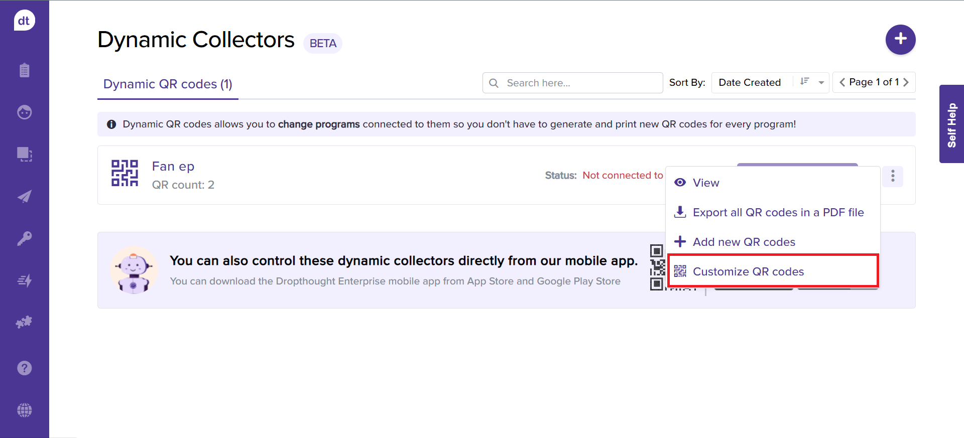 If you want to customize the QR codes for an already created Dynamic Collector list, click on the more options and go to Customize QR codes.
