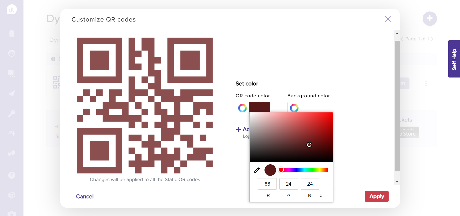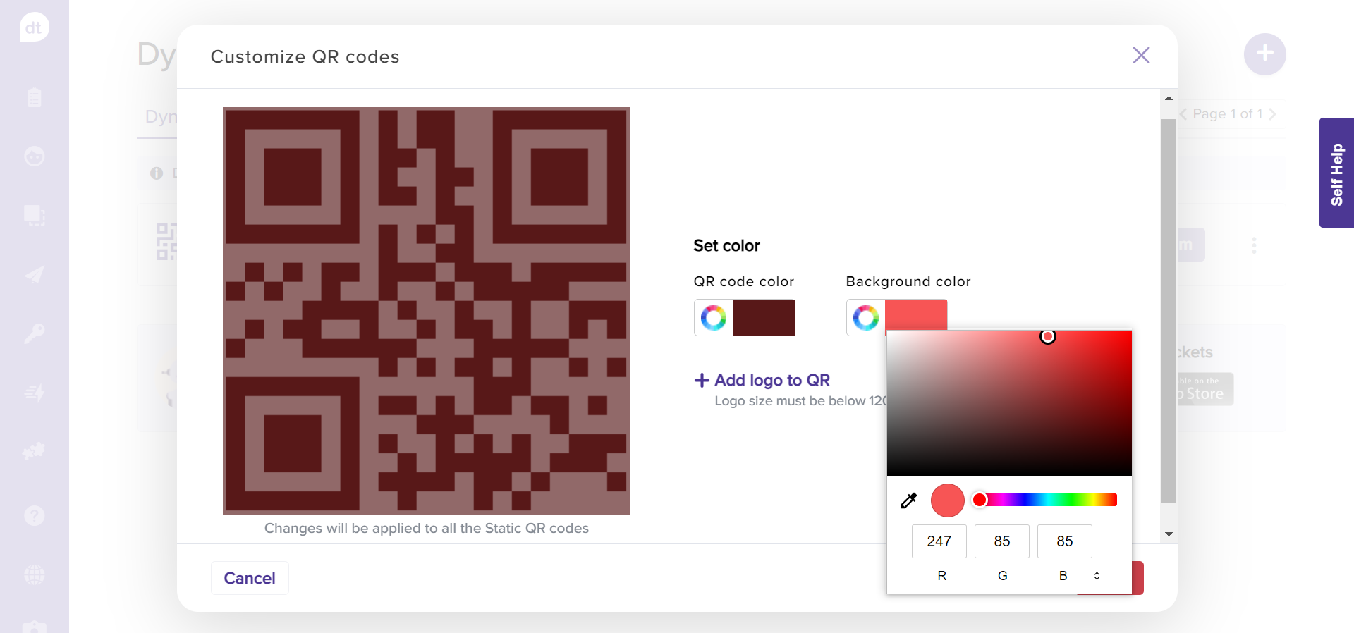 You can customize the QR codes from the Generate QR screen (if creating from scratch).