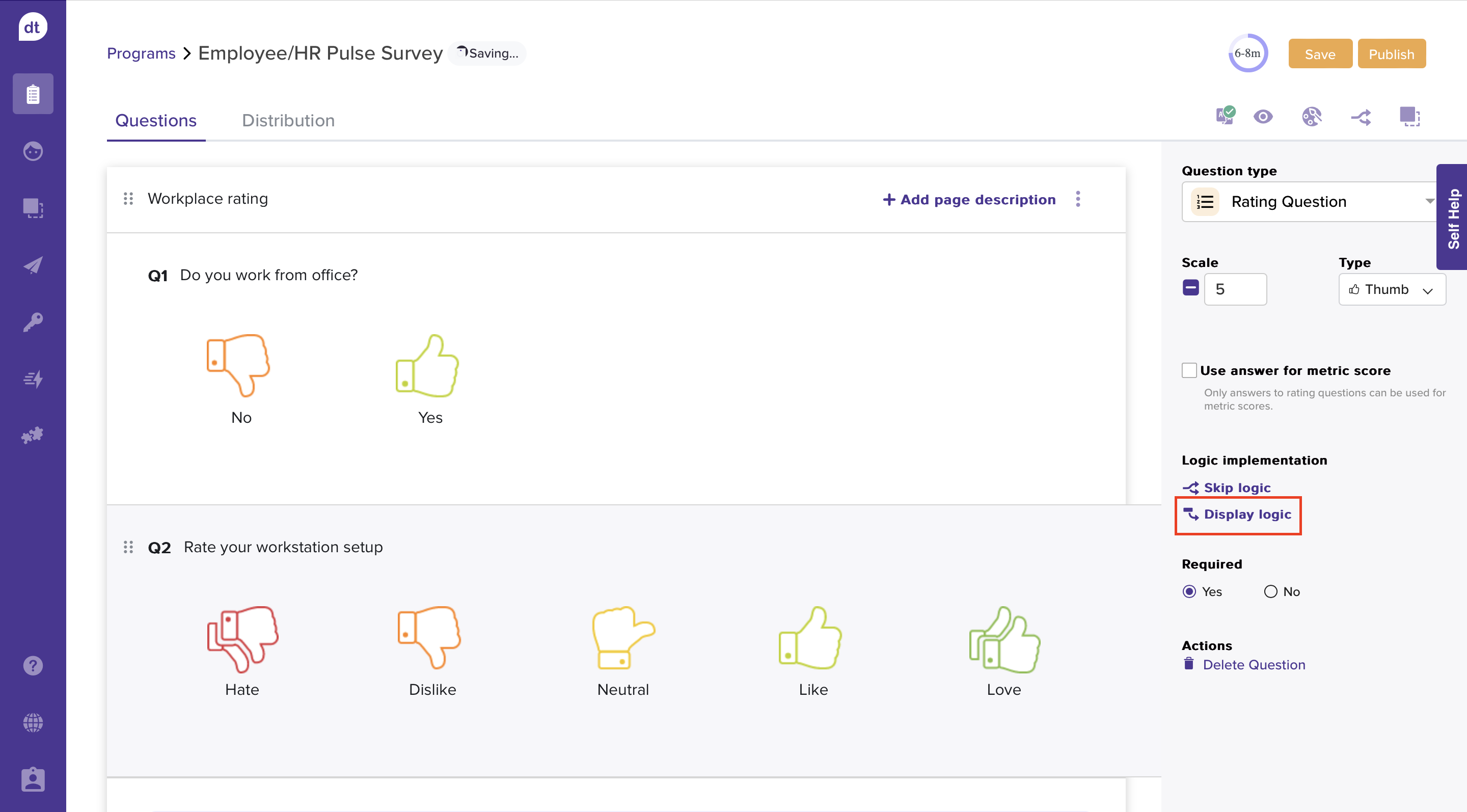 With Display Logic, you can decide whether your respondents should view the subsequent question or page. This way, you can guarantee that only the most relevant questions are displayed, ensuring you get the best possible results.