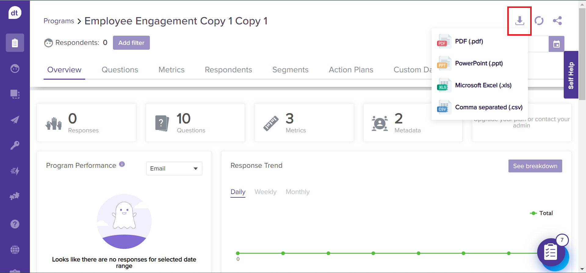 You can download a report for results obtained from each question within a date range only. No other filters can be applied.