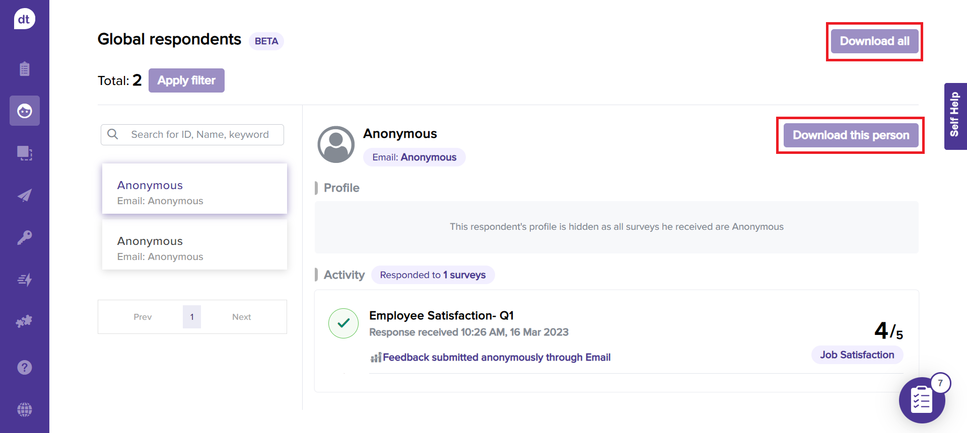 To download the global respondents, navigate to the Global Respondents tab. Locate the download button for the entire global respondents or one of the respondents.