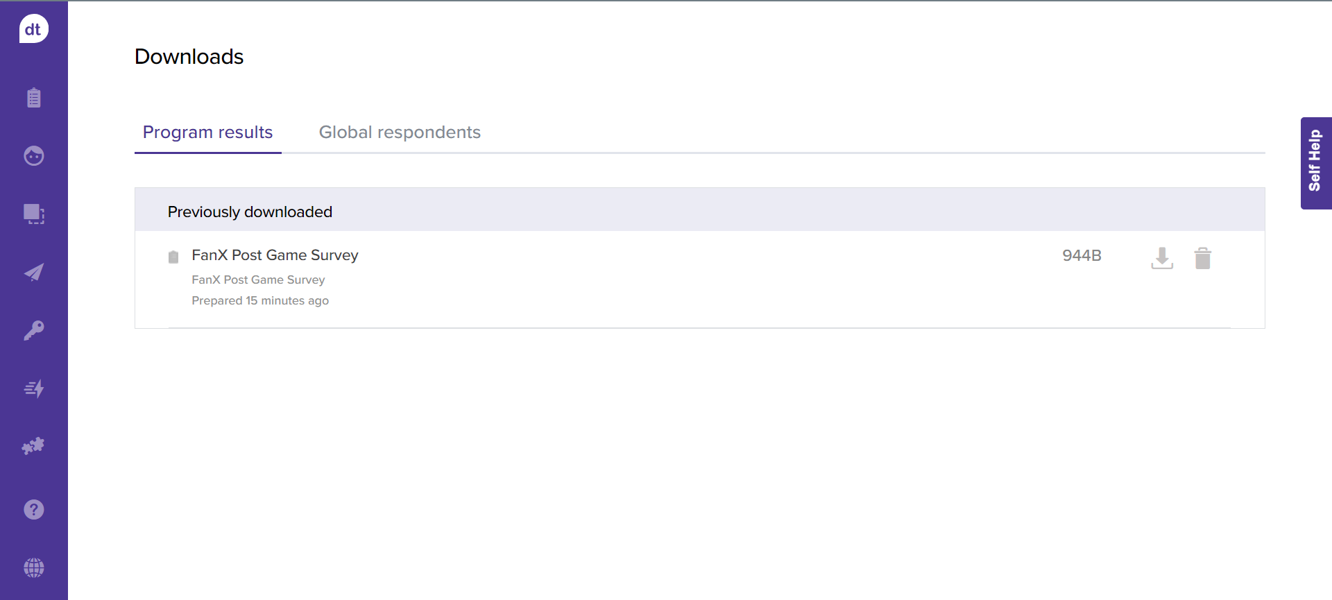 The Downloads tab displays the various data that are downloaded from Dropthought. Broadly, there are two sections here: Program Results and Global Respondents.