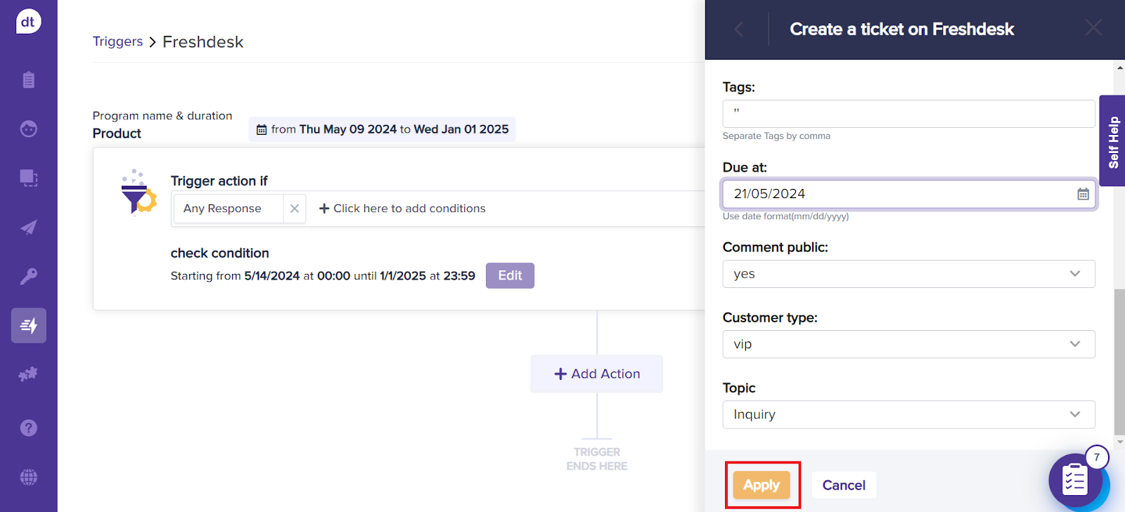 When a response received in Dropthought satisfies the trigger condition, a ticket is automatically created in Freshdesk containing details as specified while setting up the workflow. This empowers you to address the issue promptly and potentially convert unhappy customers into satisfied ones.
