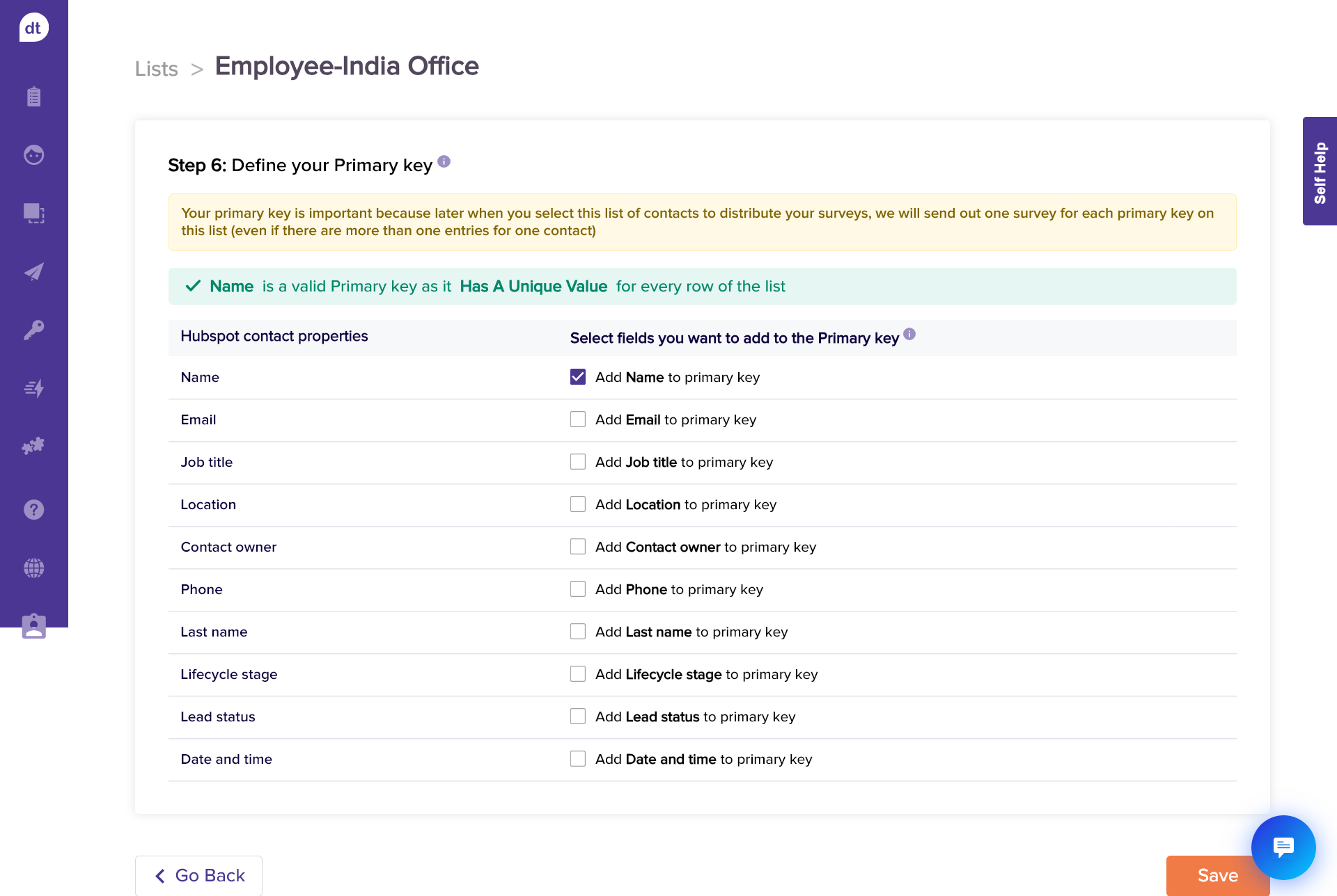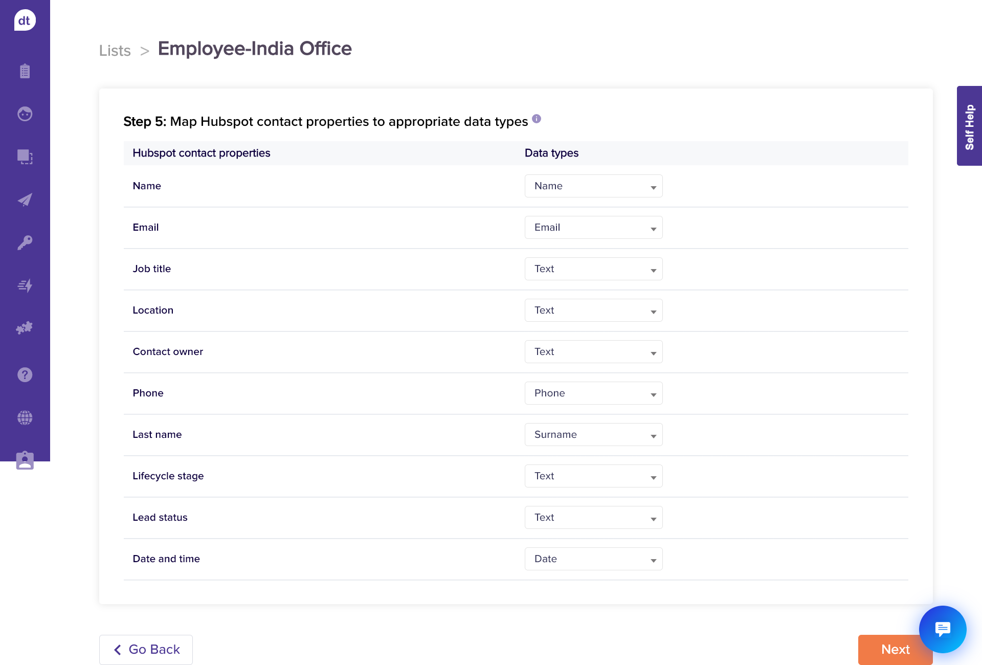 Assign appropriate datatypes to HubSpot contact properties (fields/metadata) and click on Next.
