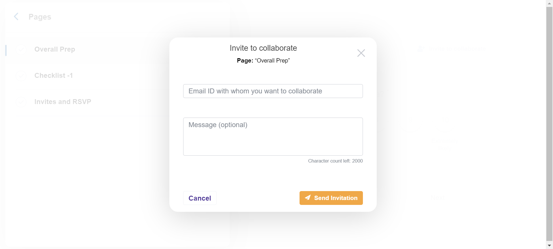 Enter the collaborator email and a message on the following pop-up. Click on Send Invitation.
