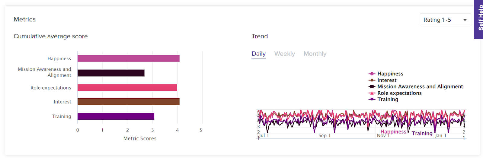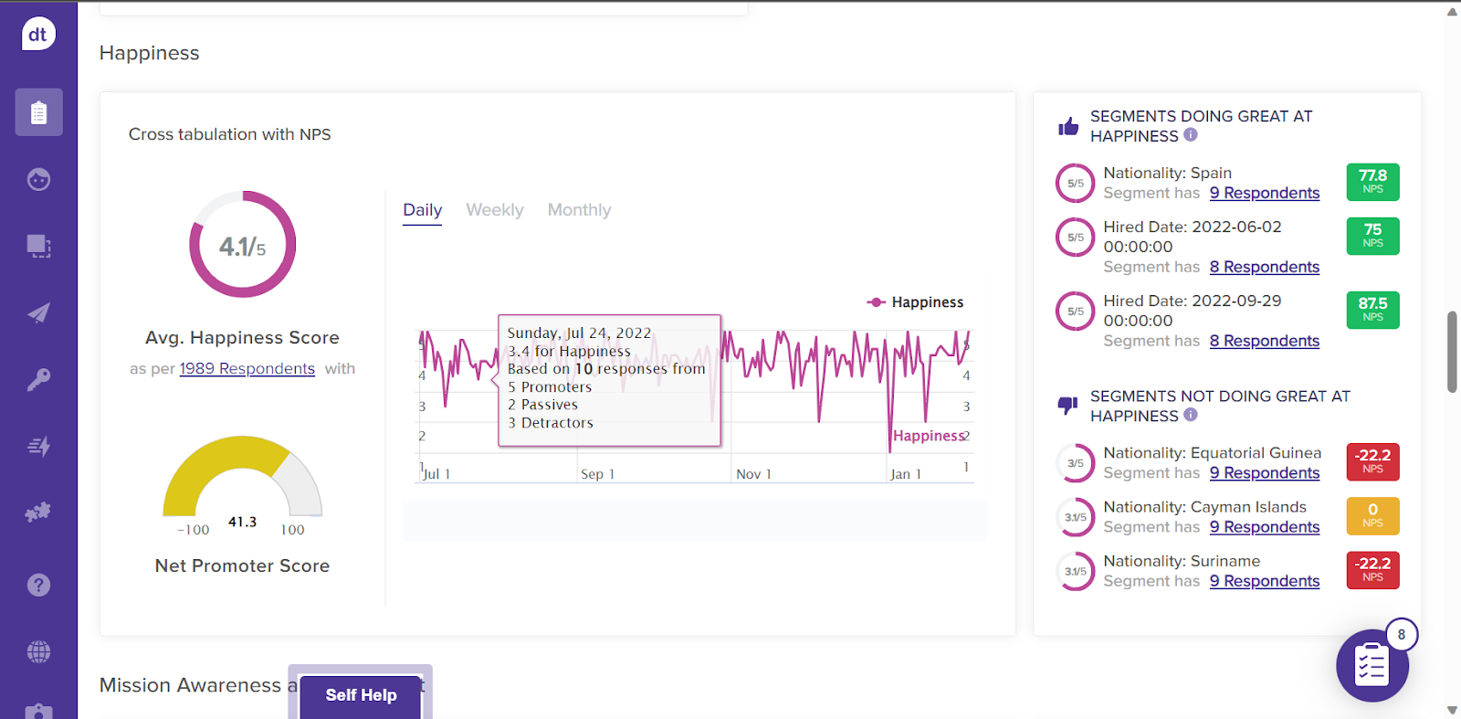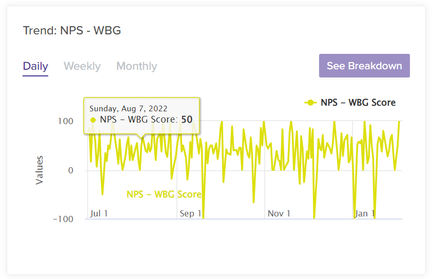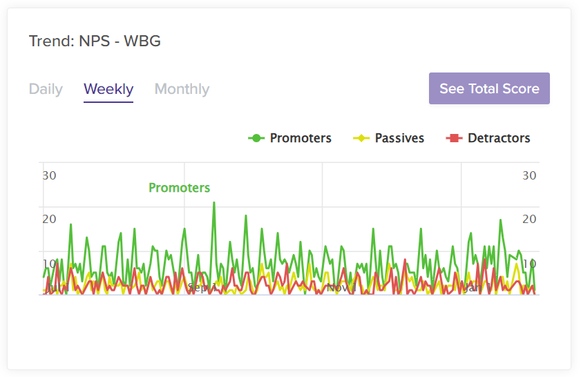 Promoters/Passives/Detractors Breakdown Fetch data on NPS trends Daily/Weekly/Monthly. |