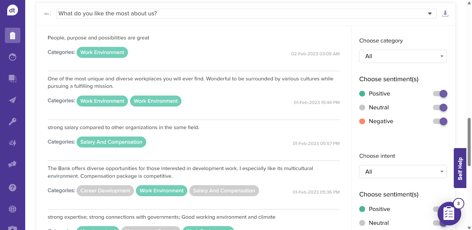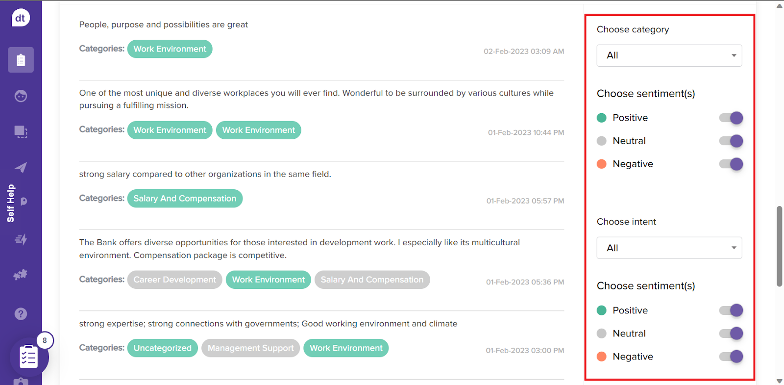 If Text Analytics is enabled The responses can be restructured using category/intent + sentiment: User can select a category from the drop-down menu and combine it with one or more sentiments. Similar functionality is available for Intent as well. |