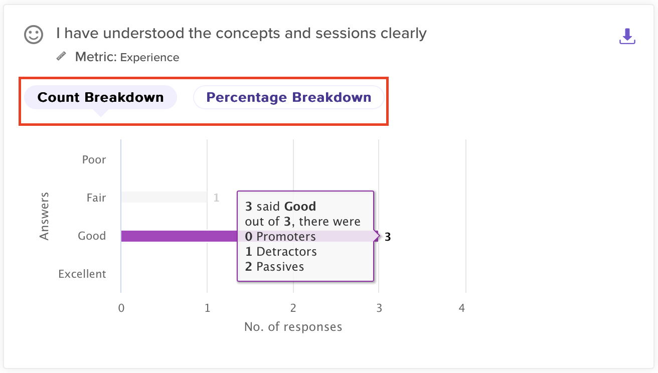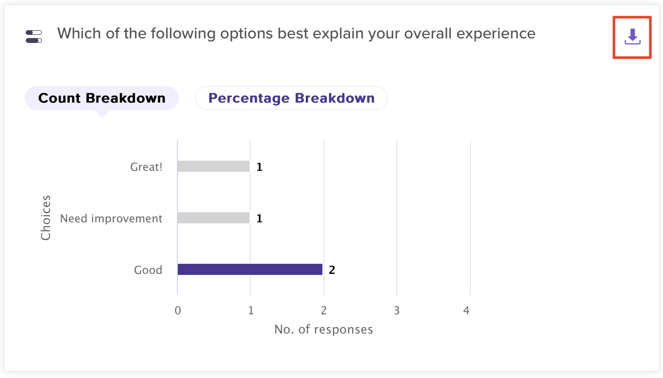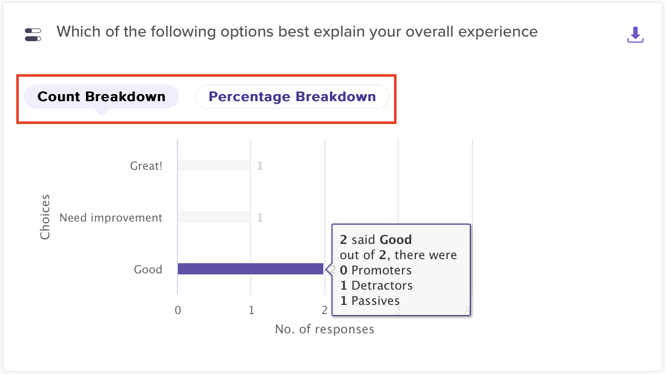 View Count Breakdown and Percentage Breakdown (only for Multiple Response type) Switch between the tabs to view the response count or percentage, as well as the count or percentage of promoters, detractors, and passives. Hover over the bar to view the number/percentage of responses along with promoters, detractors and passives received for each option. ![]() |