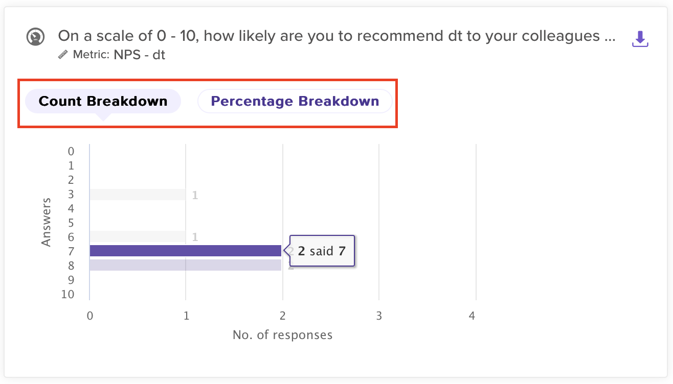 View Count Breakdown and Percentage Breakdown Switch between the tabs to view the response count or percentage for an option within NPS question. Hover over the bar to view the number/percentage of responses for each option. ![]() |