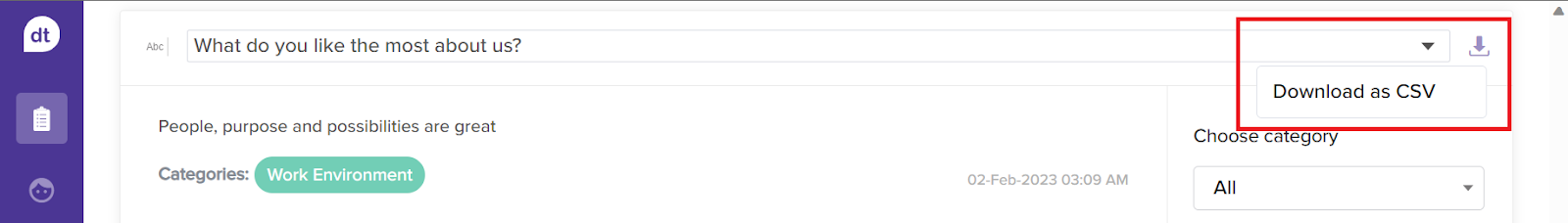 View responses received for each of the open-ended questions All the responses will be listed with related categories and date & time of response. These can be selected from the drop down menu. |