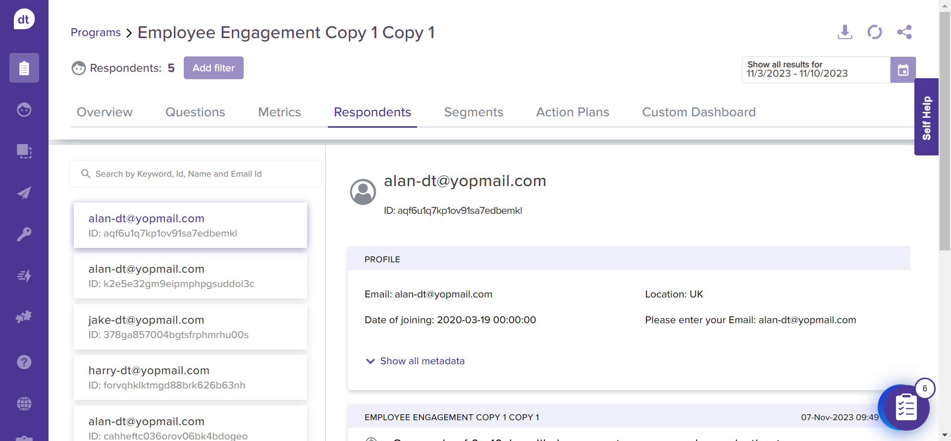 The Respondents tab displays all the responses mapped to the respective respondents. You can view the response given for each of the questions by the respondent.