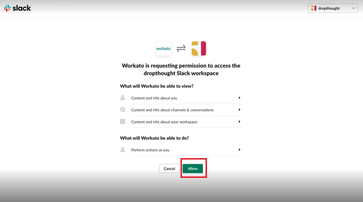 Follow the steps guided by Workato from the following screen to complete the integration process.