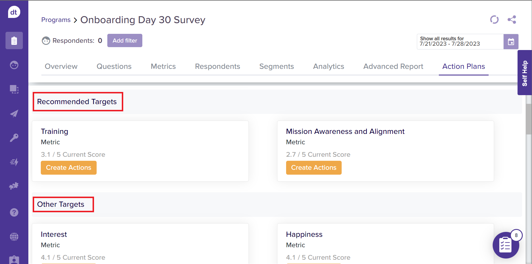 Any Action Plans you create (using the “Create Action” button as given in the next step) unassociated with any Metric or Category will be automatically collected inside a card or folder and will be marked as Target: Miscellaneous Targets.