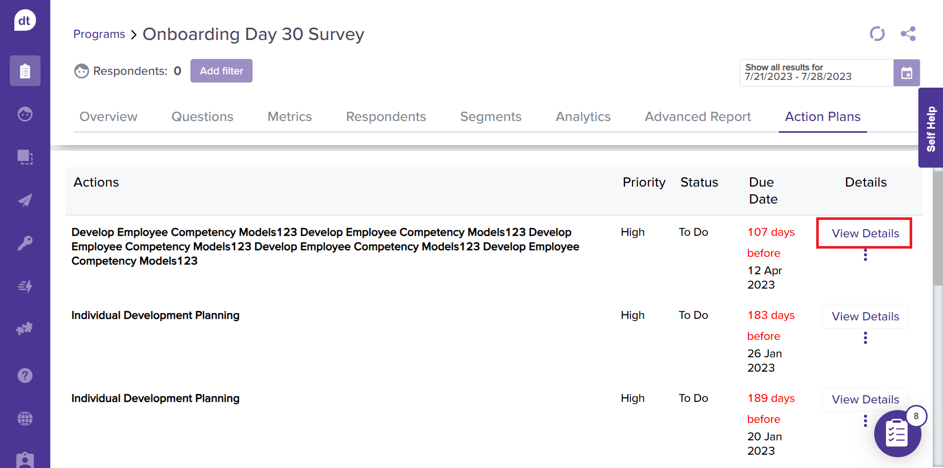 The following screen will display all the Action Plans available for the respective Target Areas, their priority scale, current status, and due date.
