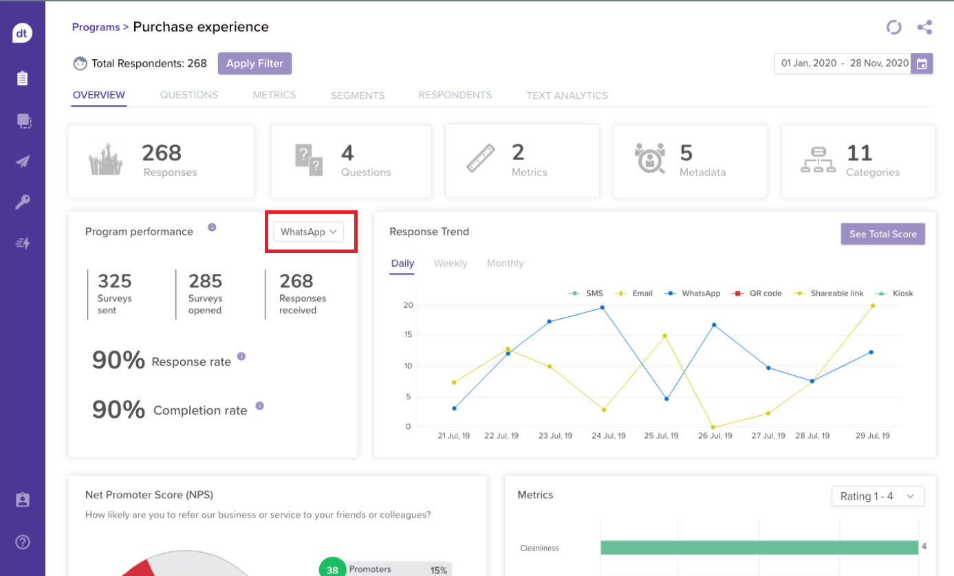 Once you start receiving responses for the Program, the data will be populated on the respective Reports tab. Similarly, when you enable WhatsApp, you can view the responses received through the distribution channel.