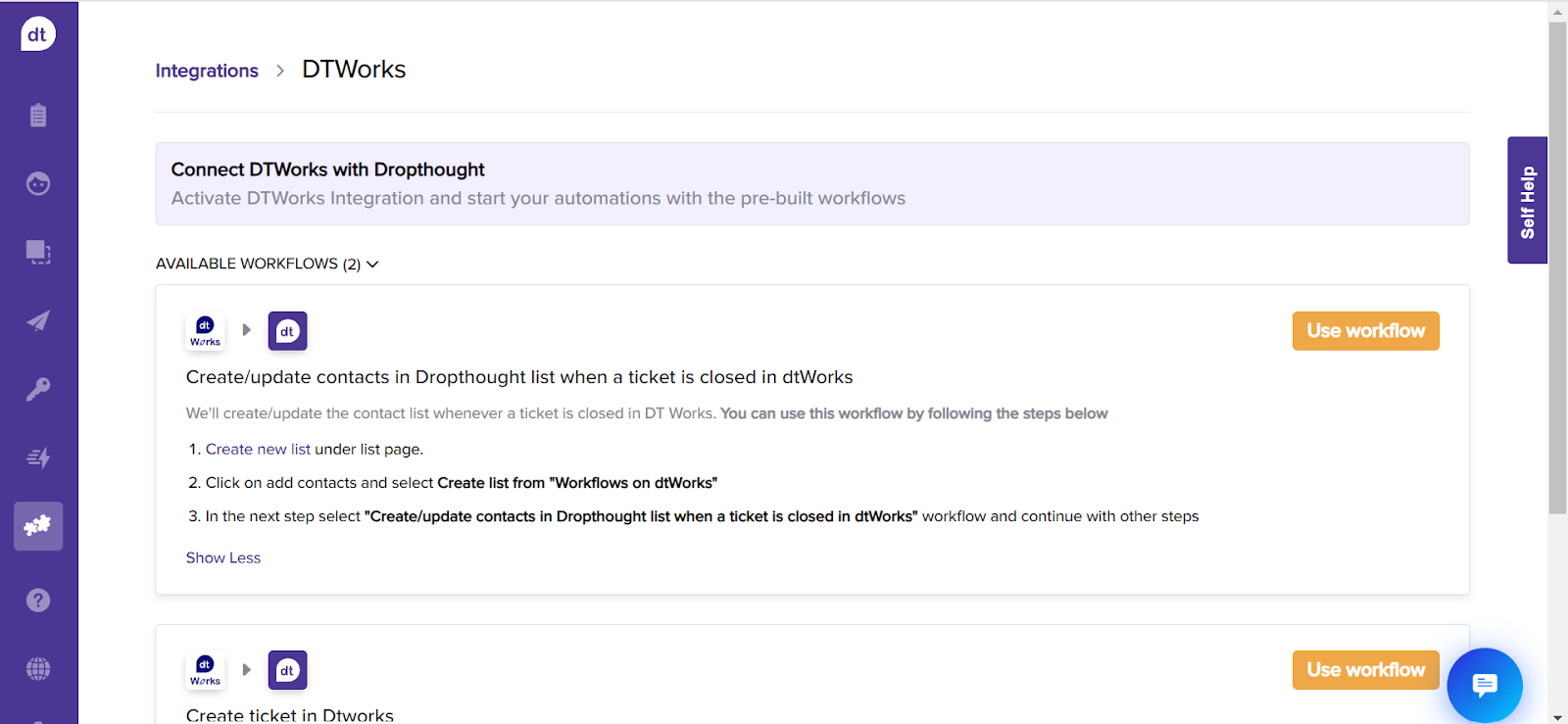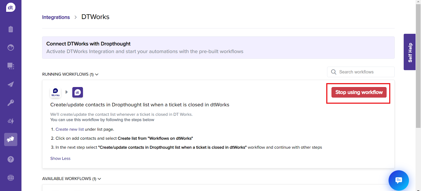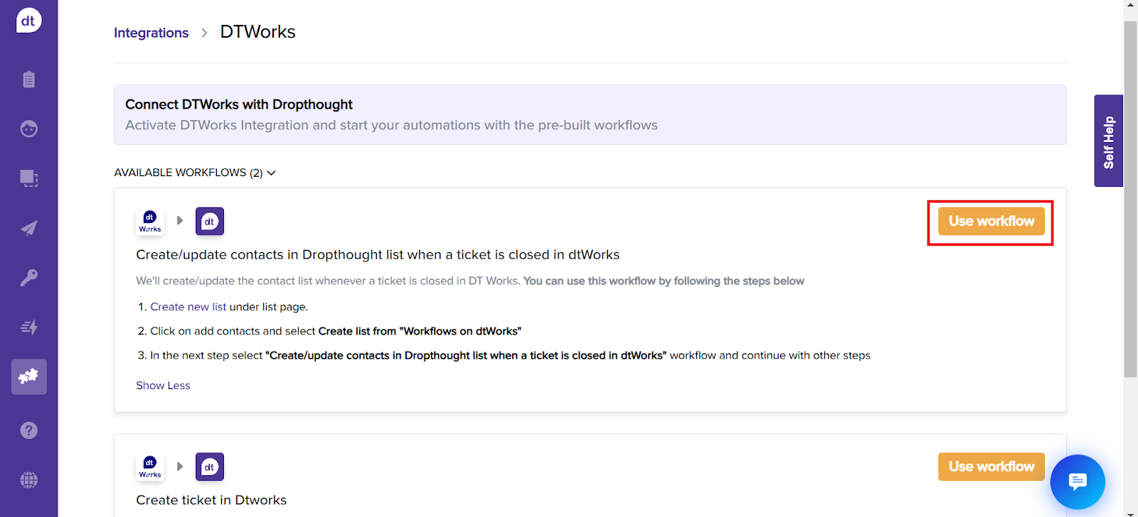 Navigate to the dtWorks integration page. Click on the dtworks logo. You can view the available workflows below the app’s logo.